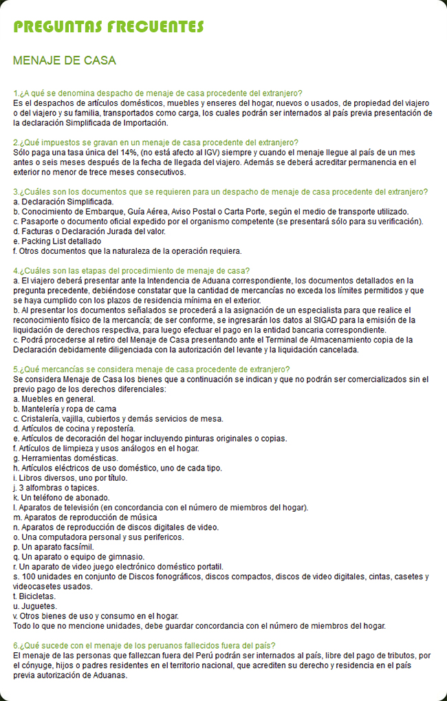 Directorio Teléfonico Horario de Aduana Trámites Aduaneros Preguntas Frecuentes Equipaje Exportación Definitiva Importación Definitiva Menaje de Casa